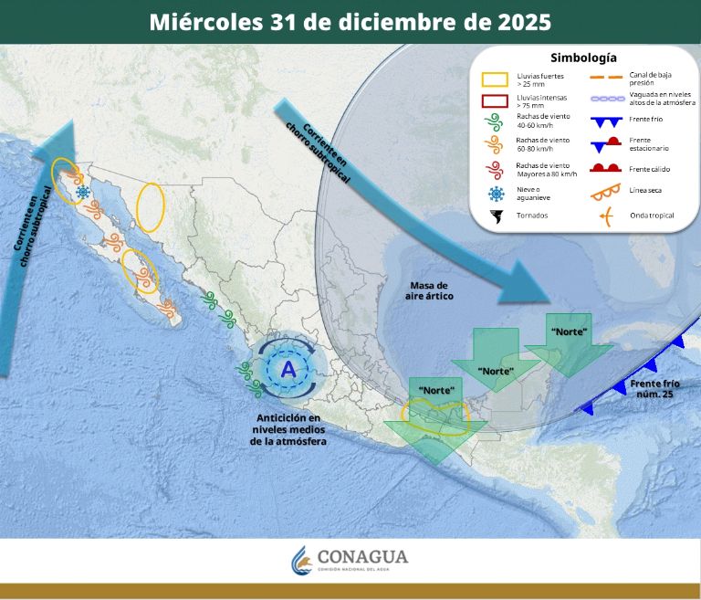 El jueves, la vaguada en niveles medios y altos de la atmósfera en combinación con la corriente en chorro subtropical se extenderán sobre el noroeste del territorio mexicano, originando rachas fuertes de viento, chubascos y lluvias fuertes a puntuales muy fuertes en dicha región, además de mantener la probabilidad de caída de nieve o aguanieve durante la mañana en sierras de Baja California, Sonora y Chihuahua. Se prevé que, durante la tarde, la vaguada se empiece a debilitar, dejando de afectar al país.