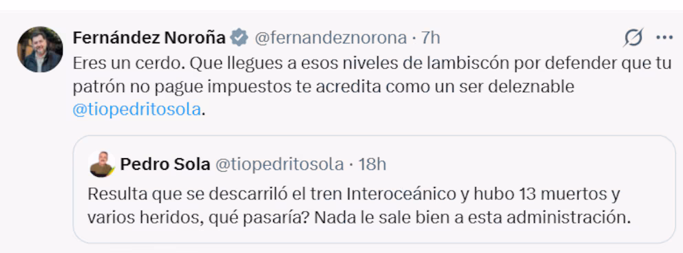 Noroña arremete contra Pedrito Sola por su crítica al accidente del Tren Interoceánico: “Eres un cerdo”