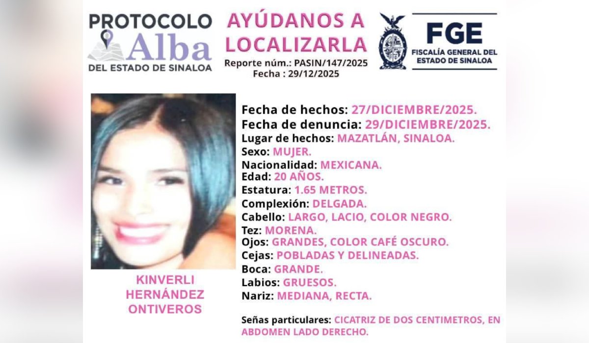 Mazatlán, Sin (RI Noticias). – La Fiscalía de Sinaloa activó el protocolo Alba para localizar a Kinverli Hernández Ontiveros, desaparecida en la ciudad de Mazatlán.