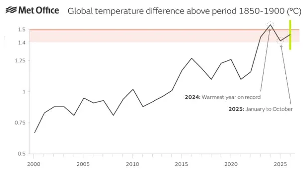 “En 2024 se registró el primer exceso temporal de 1.5°C y nuestras previsiones para 2026 sugieren que esto podría ocurrir nuevamente. Esto resalta lo rápidamente que nos estamos acercando ahora al objetivo de 1,5°C del Acuerdo de París”, declaró el Dr. Nick Dunstone del Met Office