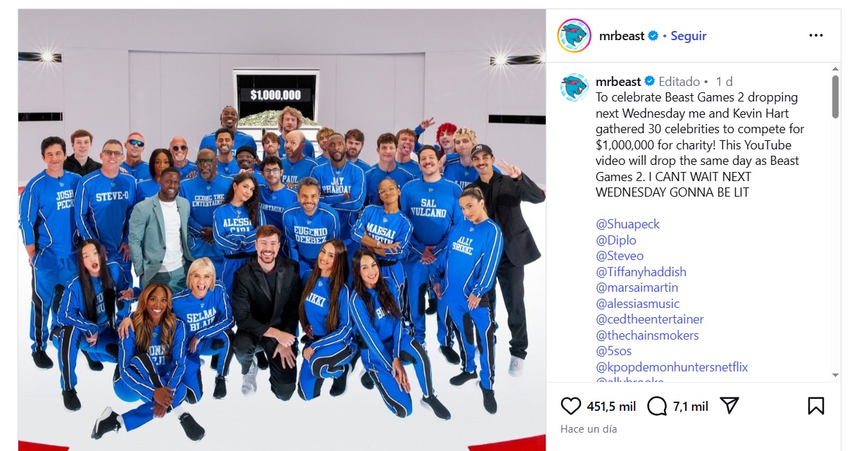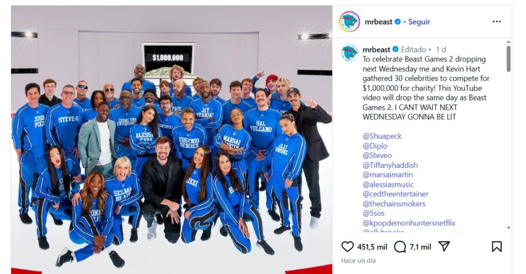 “Para celebrar el lanzamiento de Beast Games 2 el próximo miércoles, Kevin Hart y yo hemos reunido a 30 famosos para competir por un millón de dólares para obras benéficas. Este video de YouTube se publicará el mismo día que Beast Games 2. NO PUEDO ESPERAR, EL PRÓXIMO MIÉRCOLES VA A SER INCREÍBLE“, publicó MrBeast a través de Instagram.