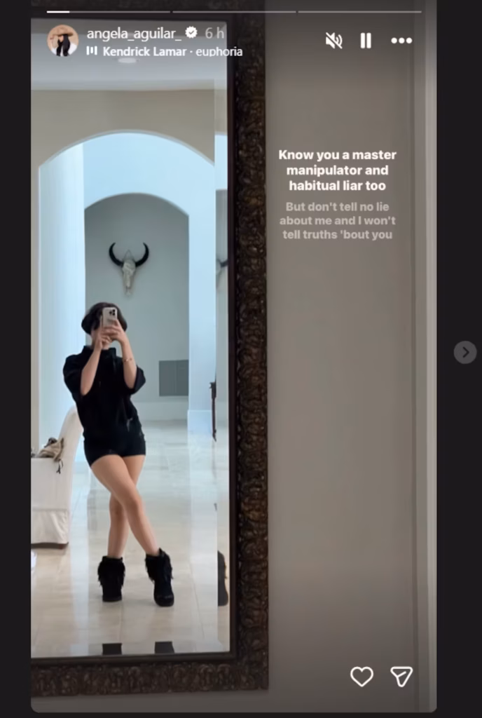 A finales de diciembre, Ángela Aguilar citó en Instagram un extracto de la canción “Euphoria” de Kendrick Lamar: “Sé que eres un maestro manipulador y también un mentiroso habitual… No digas mentiras sobre mí y yo no diré verdades sobre ti”.