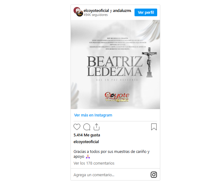 Después de que se confirmara la muerte de Beatriz Ledezma, hermana de José Ángel Ledezma, mejor conocido como “El Coyote”, el cantante subió un desgarrador mensaje para darle el último adiós a su familiar, recibiendo el apoyo de todos sus fans.