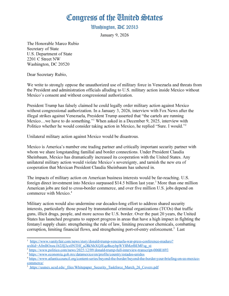 “Escribimos para oponernos firmemente al uso no autorizado de la fuerza militar en Venezuela y a las amenazas del presidente (Trump) y funcionarios de la Administración que aluden a acciones militares estadounidenses en México sin el consentimiento de este país y sin la autorización del Congreso”, se lee en el documento firmado este 9 de enero de 2026.