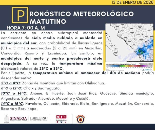 En contraste, el norte y centro del estado presentarán condiciones más estables, con cielos despejados y temperaturas que oscilarán entre los 28 y 33 grados. Para la madrugada del miércoles 14 de enero se prevé un descenso notable en las temperaturas, especialmente en zonas serranas y municipios del norte, por lo que las autoridades recomiendan tomar precauciones ante los cambios térmicos y las lluvias nocturnas.