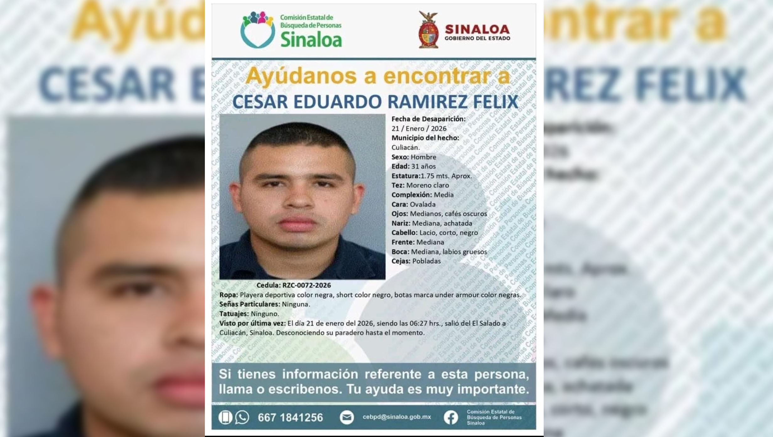 De acuerdo a la información proporcionada, el agente fue identificado como César Eduardo de 31 años quien fue visto por última vez alrededor de las 6:20 horas.