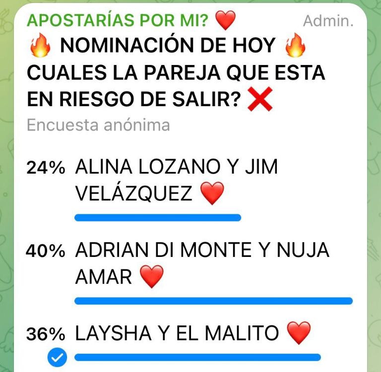 Es importante aclarar que los datos que te presentamos a continuación no son estadísticas oficiales de ViX. Sin embargo, en el mundo de los realities, los grupos de fans en Telegram suelen ser un termómetro muy preciso de lo que ocurre en las votaciones masivas.