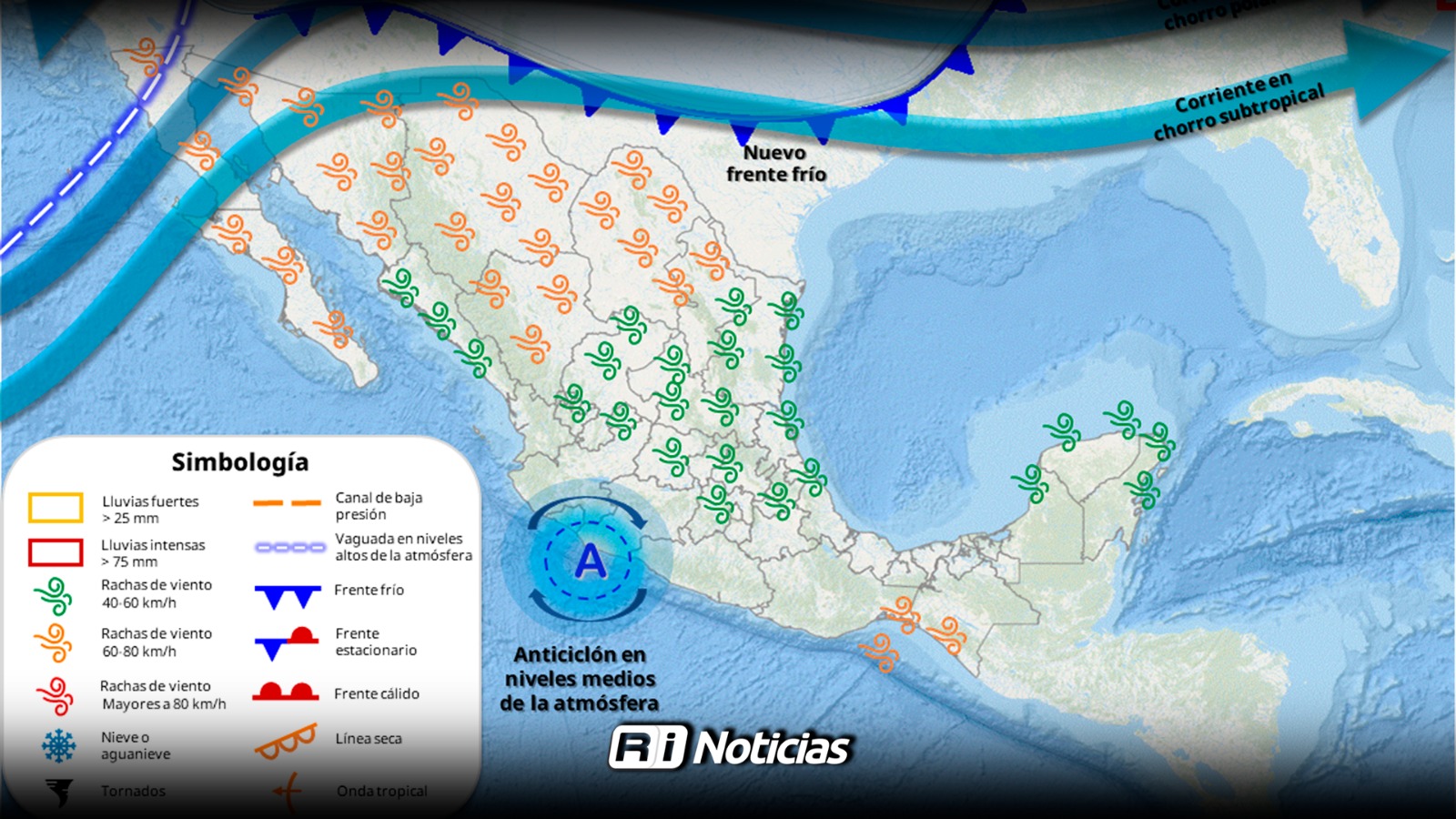 El frente frío No. 32, junto con una corriente anticiclónica en niveles medios de la atmósfera, generará vientos fuertes, un marcado descenso térmico en el norte y noreste del país, y lluvias en zonas del sureste, aunque Sinaloa se mantendrá en gran parte con cielo nublado pero seco.