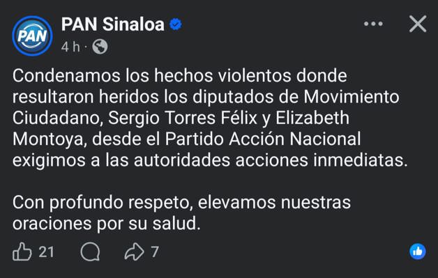 A través de sus redes sociales, el PAN emitió un comunicado en donde exige a las autoridades acciones inmediatas tras el atentado sufrido por los diputados de Movimiento Ciudadano, Sergio Torres y Elizabeth Montoya.