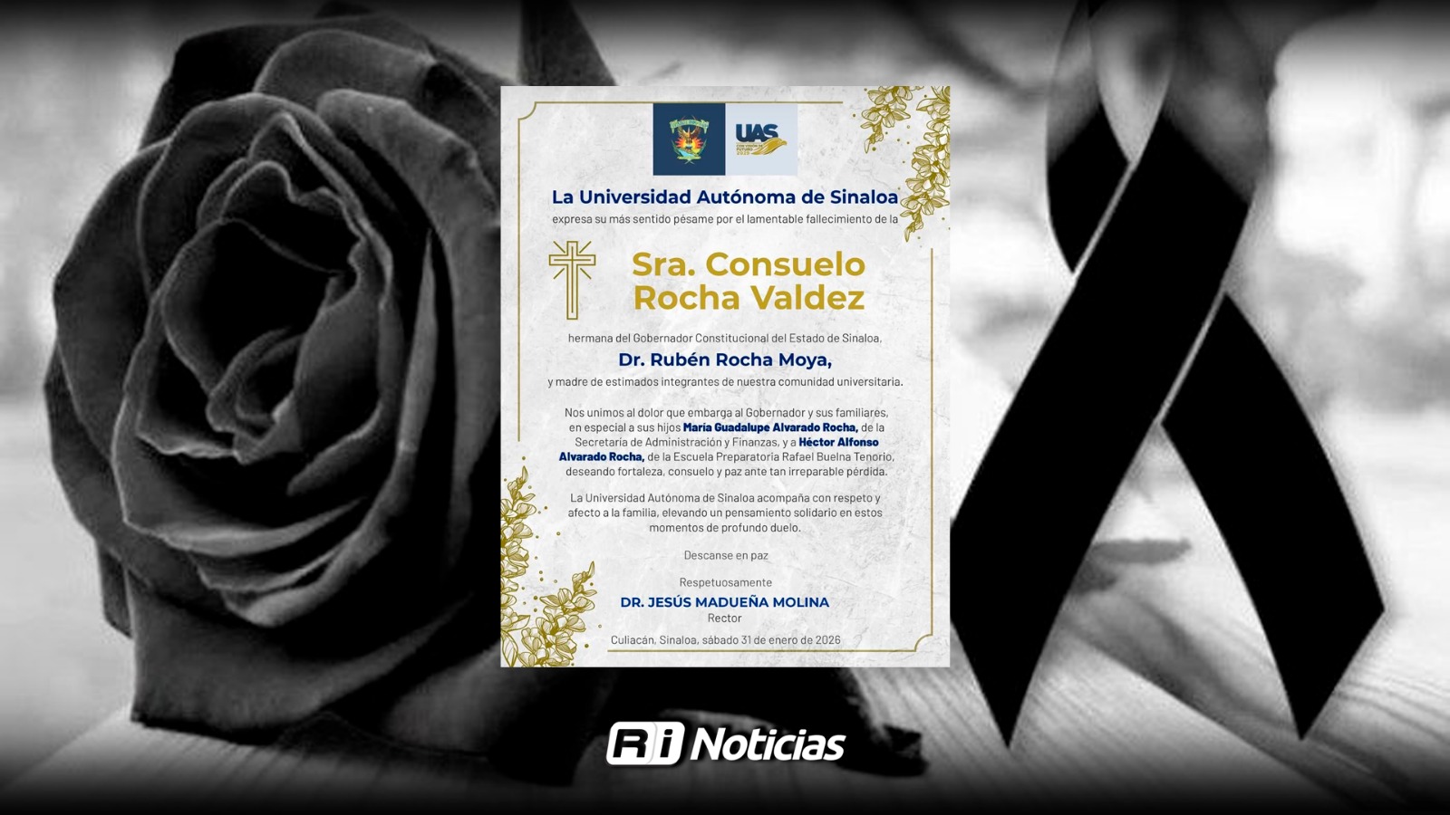 La esquela fue firmada por el rector de la máxima casa de estudios, Jesús Madueña Molina, quien destacó que la institución acompaña con solidaridad y profundo respeto a la familia Rocha ante esta irreparable pérdida.