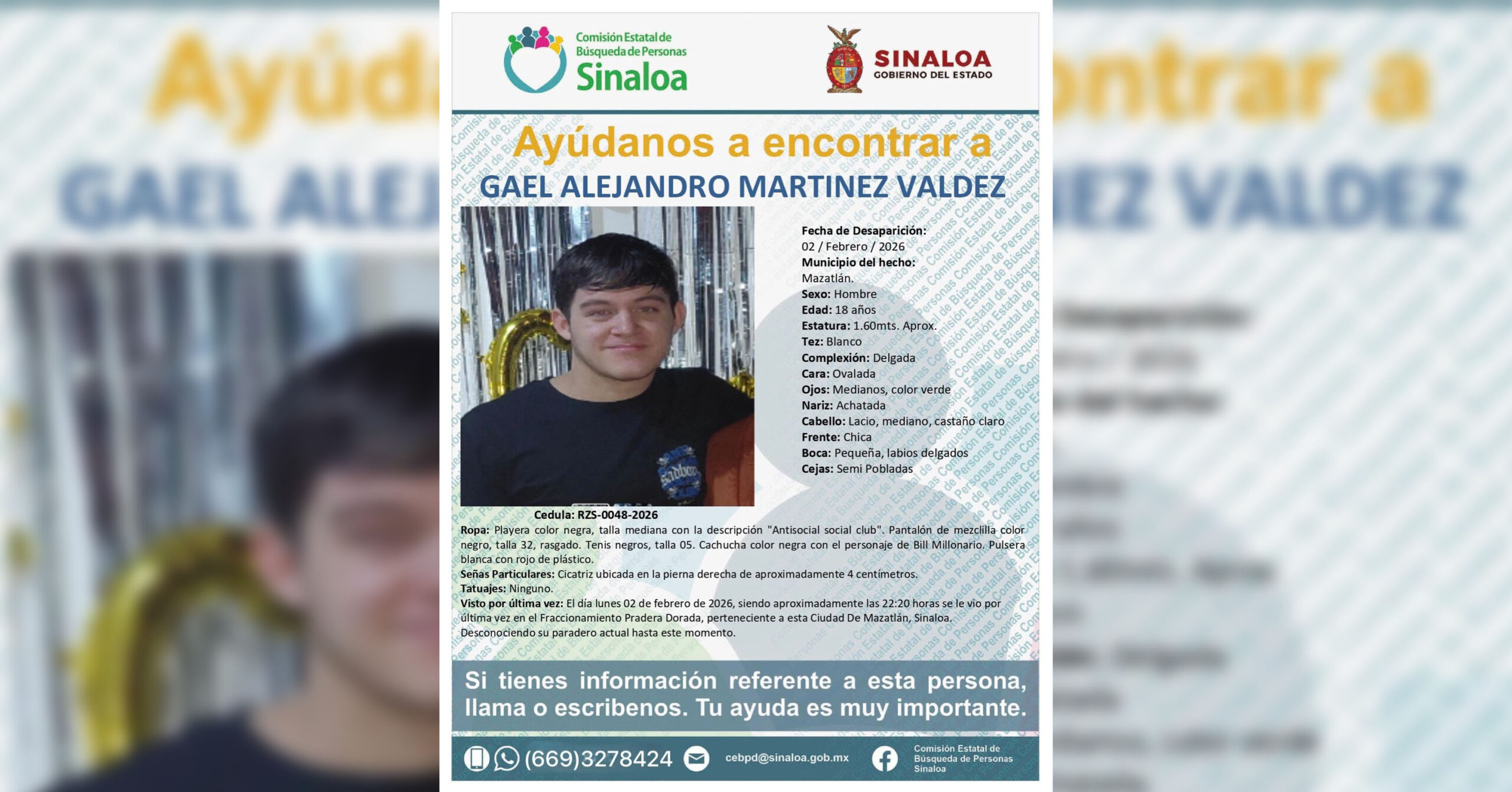De acuerdo con la ficha de búsqueda de la Comisión Estatal de Búsqueda de Personas de Sinaloa, Gael Alejandro fue visto por última vez a las 22:20 horas del lunes 2 de febrero y desde entonces su familiares y seres queridos no tienen información sobre su paradero.