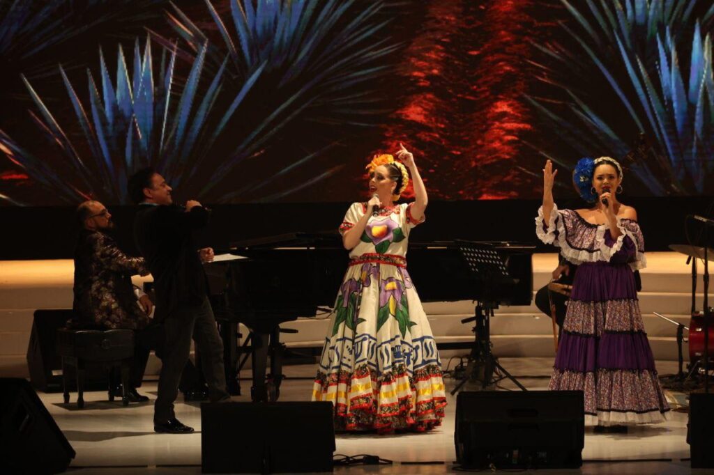 En momentos que emocionaron al público las voces de Adán Pérez, Rebeca de Rueda y Sarah Holcombe dieron vida a clásicos como Cucurrucucú, Échame a mí la culpa, Nana Pancha, Ley del Monte, Cien años, Noches de Mazatlán, El Pávido Návido, Las Isabeles, La India Bonita y Es demasiado tarde, entre otras.