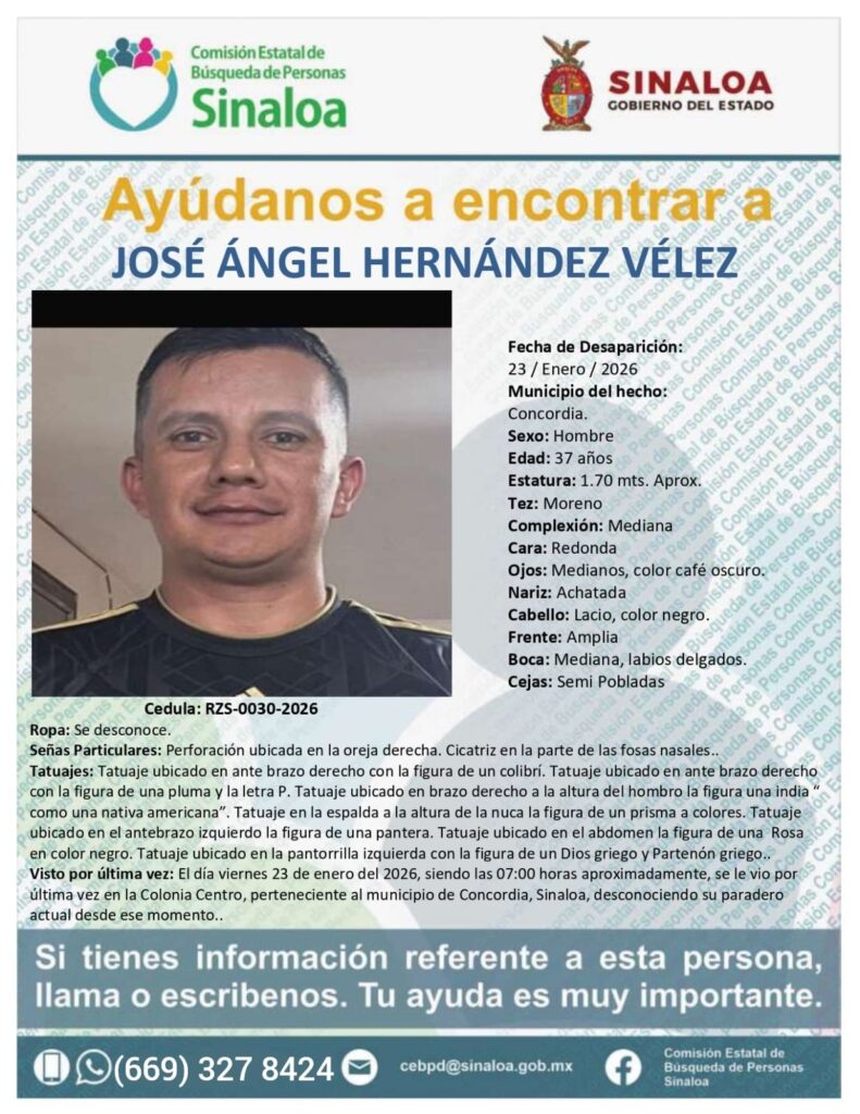 José Ángel Hernández Vélez, originario de Zacatecas y reportado como desaparecido desde el 23 de enero, fue identificado por su familia tras el hallazgo en el poblado de El Verde.