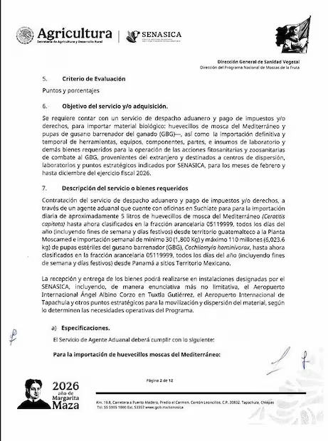“Contratación del servicio de despacho aduanero y pago de impuestos y/o derechos, a través de un agente aduanal que cuente con oficinas en Suchiate [Chiapas] para la importación diaria de aproximadamente 5 litros de huevecillos de mosca del Mediterráneo [Ceratitis capitata] todos los días del año [incluyendo fines de semana y días festivos] desde territorio guatemalteco a la Planta Moscamed, e importación semanal de mínimo 30 millones (mil 800 Kg) y máximo 110 millones (6 mil 023.6 kg) de pupas estériles del gusano barrenador [Cochliomyia hominivorax] todos los días del año desde Panamá a sitios en territorio mexicano”.