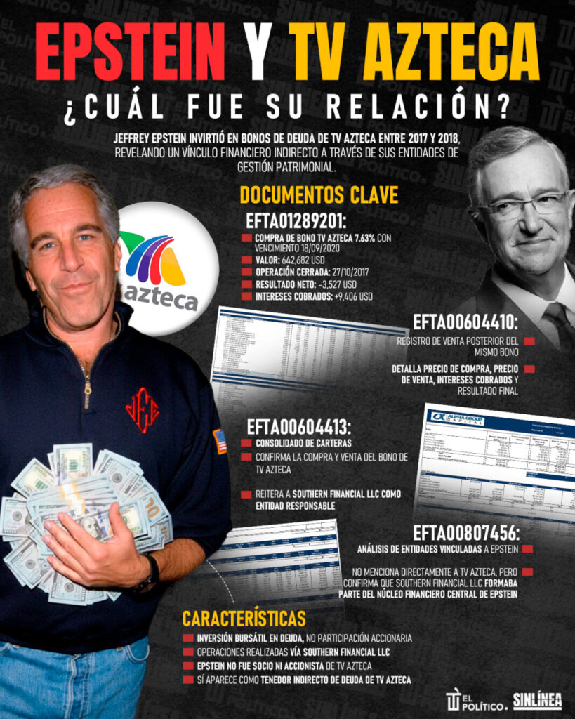 Más allá del cruce discursivo, existen documentos financieros que acreditan que Jeffrey Epstein sí tuvo una relación económica con una de las empresas de Salinas Pliego. Archivos contenidos en los llamados Epstein Files muestran que el magnate estadounidense invirtió en bonos de deuda de TV Azteca, S.A.B. de C.V., entre 2017 y 2018, a través de Southern Financial LLC, una de las entidades utilizadas para la gestión de su patrimonio.