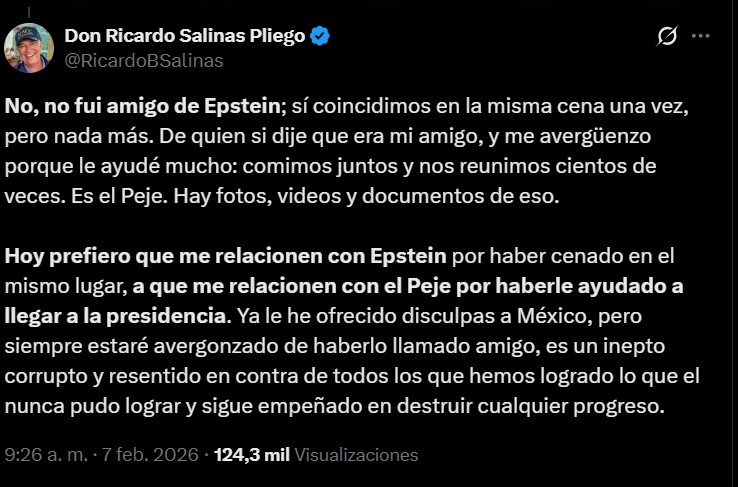 “Hoy prefiero que me relacionen con Epstein por haber cenado en el mismo lugar, a que me relacionen con el Peje por haberle ayudado a llegar a la presidencia”, escribió.
