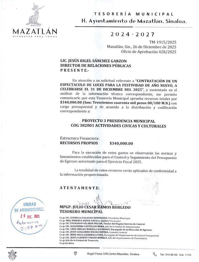 Mazatlán, Sin. (RI Noticias).- El pasado 31 de diciembre de 2025, se destinó un gasto de 336 mil pesos para la realización de un espectáculo de luces, un monto que ha generado controversia por el alto costo de su ejecución. Esta inversión ha sido puesta bajo la lupa debido a la constante promoción de estos eventos como beneficios sin costo para la población, cuando en realidad se cubren íntegramente con recursos de los contribuyentes, denunció el director Gustavo Enrique Rojo Navarro al frente del Observatorio Ciudadano de Mazatlán (OCM).
