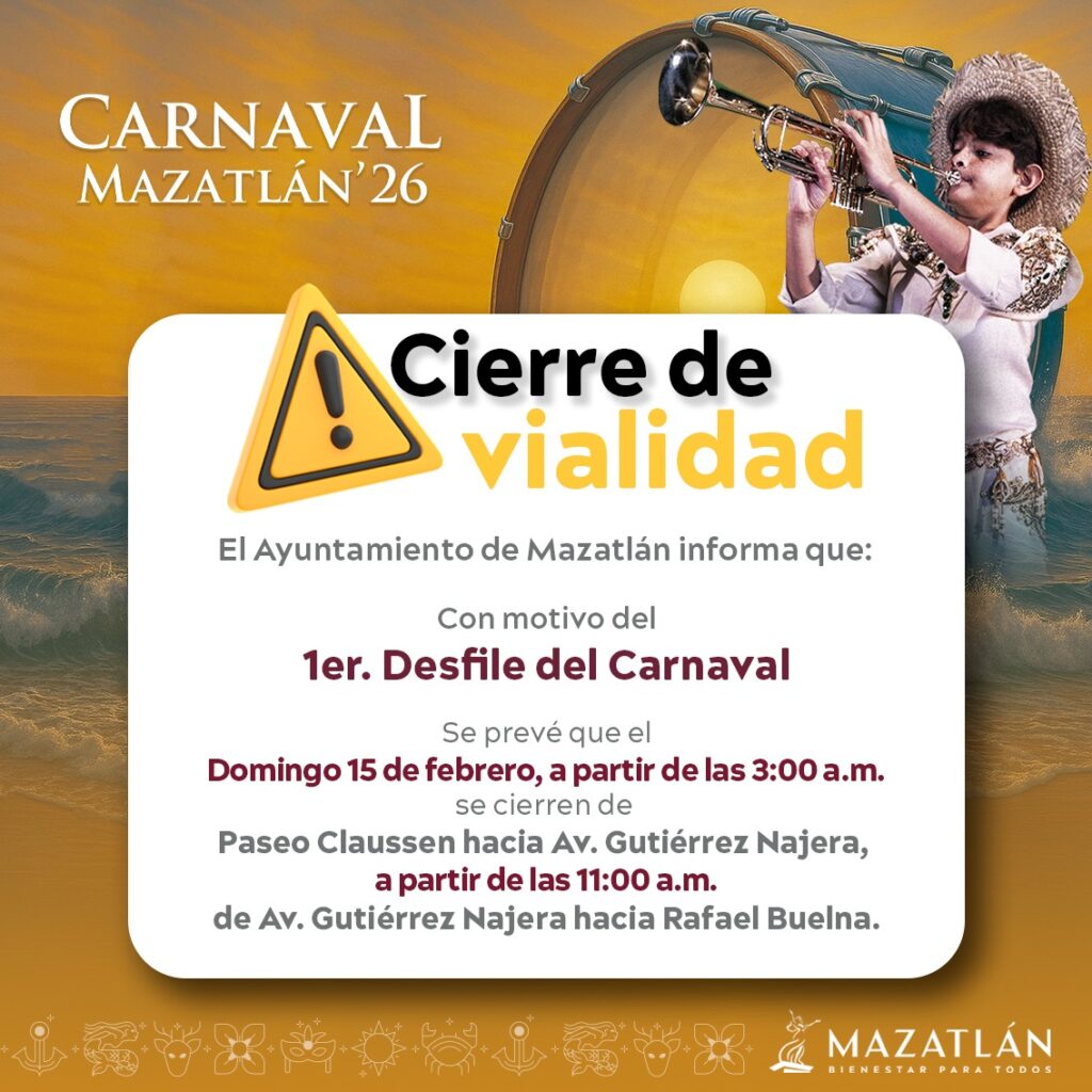Mazatlán, Sinaloa. – Con motivo del tradicional desfile de carros alegóricos del Carnaval de Mazatlán, la Secretaría de Seguridad Pública Municipal y la Unidad de Vialidad informaron sobre el cierre a la circulación de la Avenida del Mar y sus bocacalles.