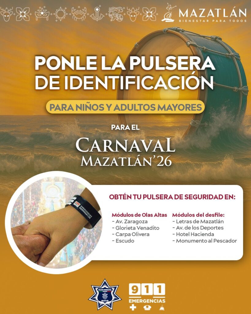 Mazatlán, Sinaloa. – La Secretaría de Seguridad Pública Municipal, a través del Departamento de Programas Preventivos, puso en marcha la campaña “Diviértete Seguro, Usa tu Pulsera”, con la finalidad de brindar mayor protección a niñas y niños que asistan con sus familias a las diversas actividades del Carnaval.