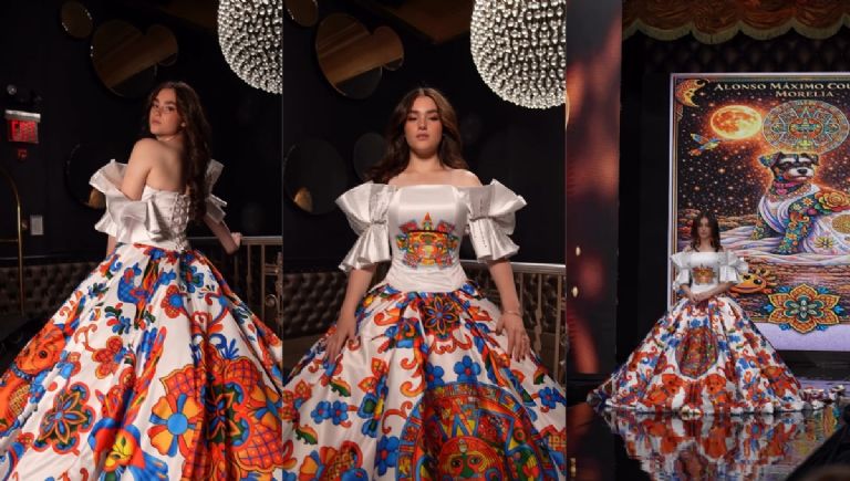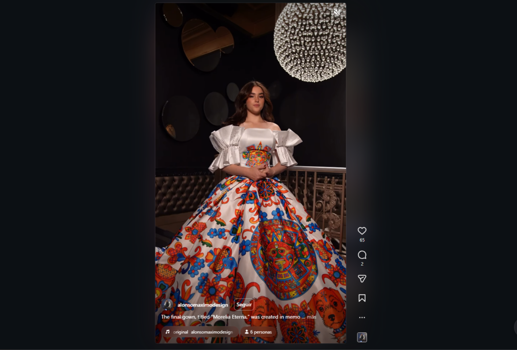El diseño destaca por un color blanco hermoso con un estampado maximalista y colores como el naranja,a amarillo y azul, que también incluye el calendario maya y varios perritos schnauzer que honran a Morelia, la mascota fallecida de Alonso Máximo. Asimismo, cuenta con una falda ampona, corsé y mangas de campesina con un toque moderno.