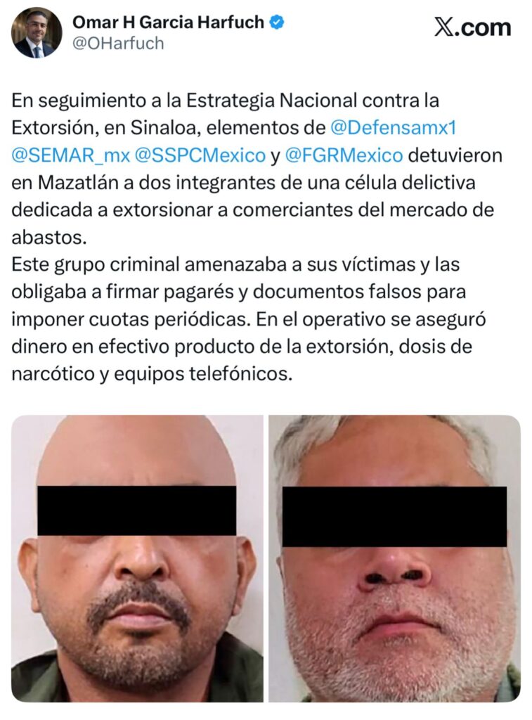 El jueves 19 de febrero de 2026 el secretario de Seguridad y Protección Ciudadana (SSPC), Omar García Harfuch, dio a conocer que gracias a la estrategia contra el delito de extorsión fueron detenidos dos integrantes de una célula delictiva dedicada a extorsionar a comerciantes del mercado de abastos en Mazatlán, a quienes bajo amenaza obligaban a firmar pagarés y documentos falsos para imponer cuotas periódicas a sus víctimas.
