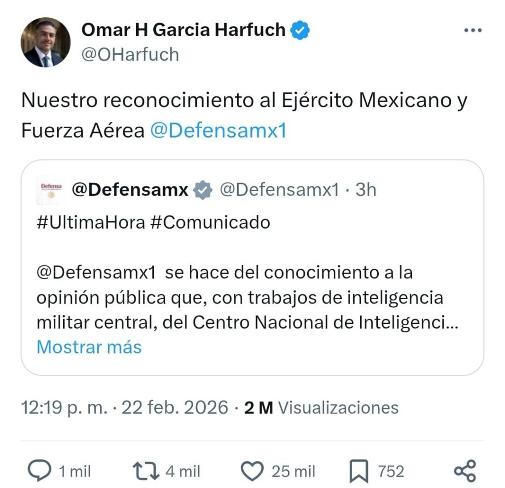 El secretario de Seguridad y Protección Ciudadana, Omar García Harfuch, externó su reconocimiento a la Secretaría de la Defensa Nacional por la captura de ‘el Mencho‘, quien murió posteriormente.