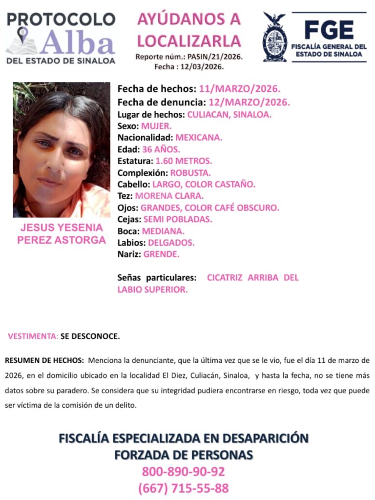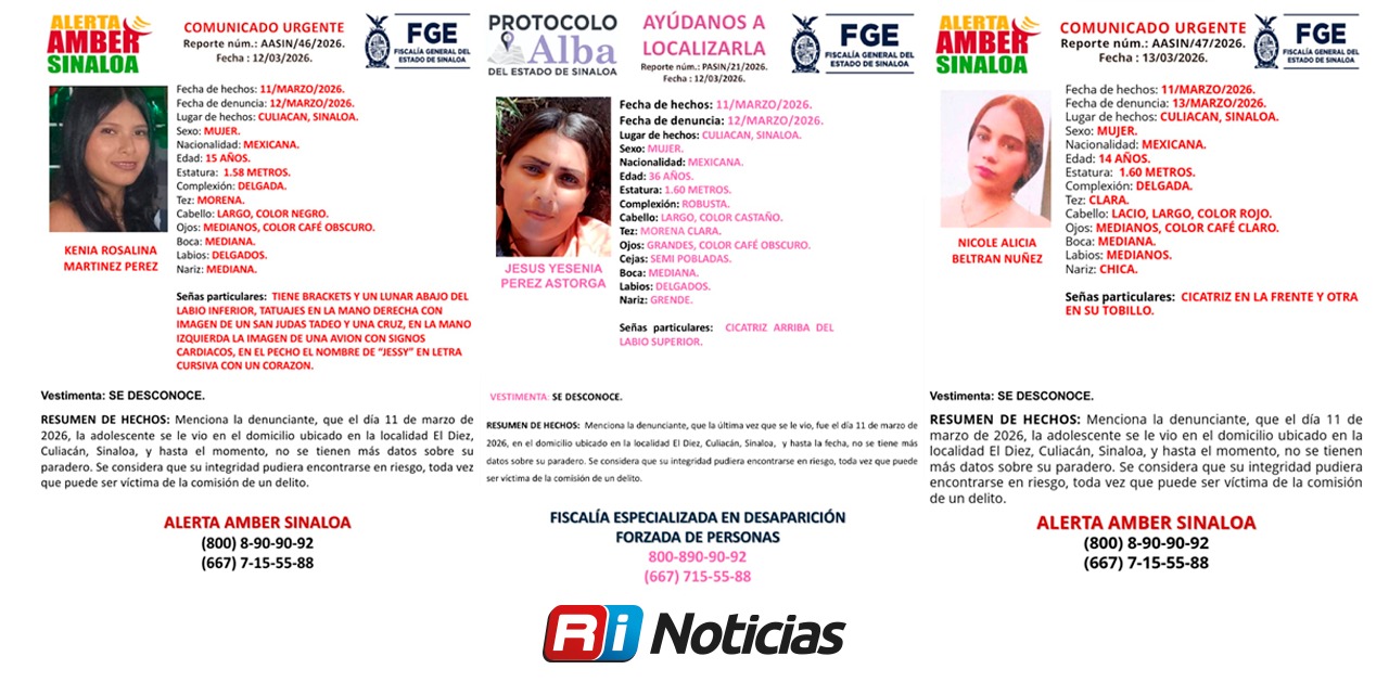 Culiacán, Sin (RI Noticias).- La Fiscalía General del Estado de Sinaloa (FGE) confirmó este viernes que tres mujeres fueron privadas de la libertad el pasado 11 de marzo en Bachigualatito, Culiacán, las cuales hoy ya cuentan con ficha de búsqueda.