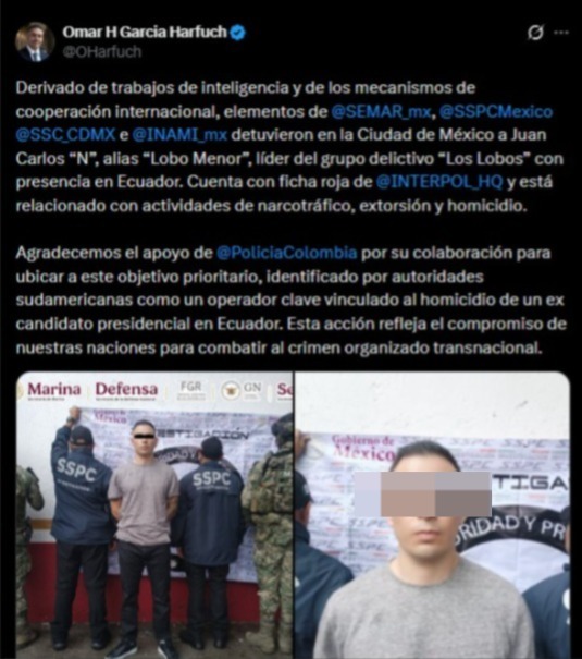 @SEMAR_mx, @SSPCMexico, @SSC_CDMX e @INAMI_mx detuvieron en la Ciudad de México a Juan Carlos “N”, alias “Lobo Menor”, líder del grupo delictivo “Los Lobos” con presencia en Ecuador. Cuenta con ficha roja de @INTERPOL_HQ