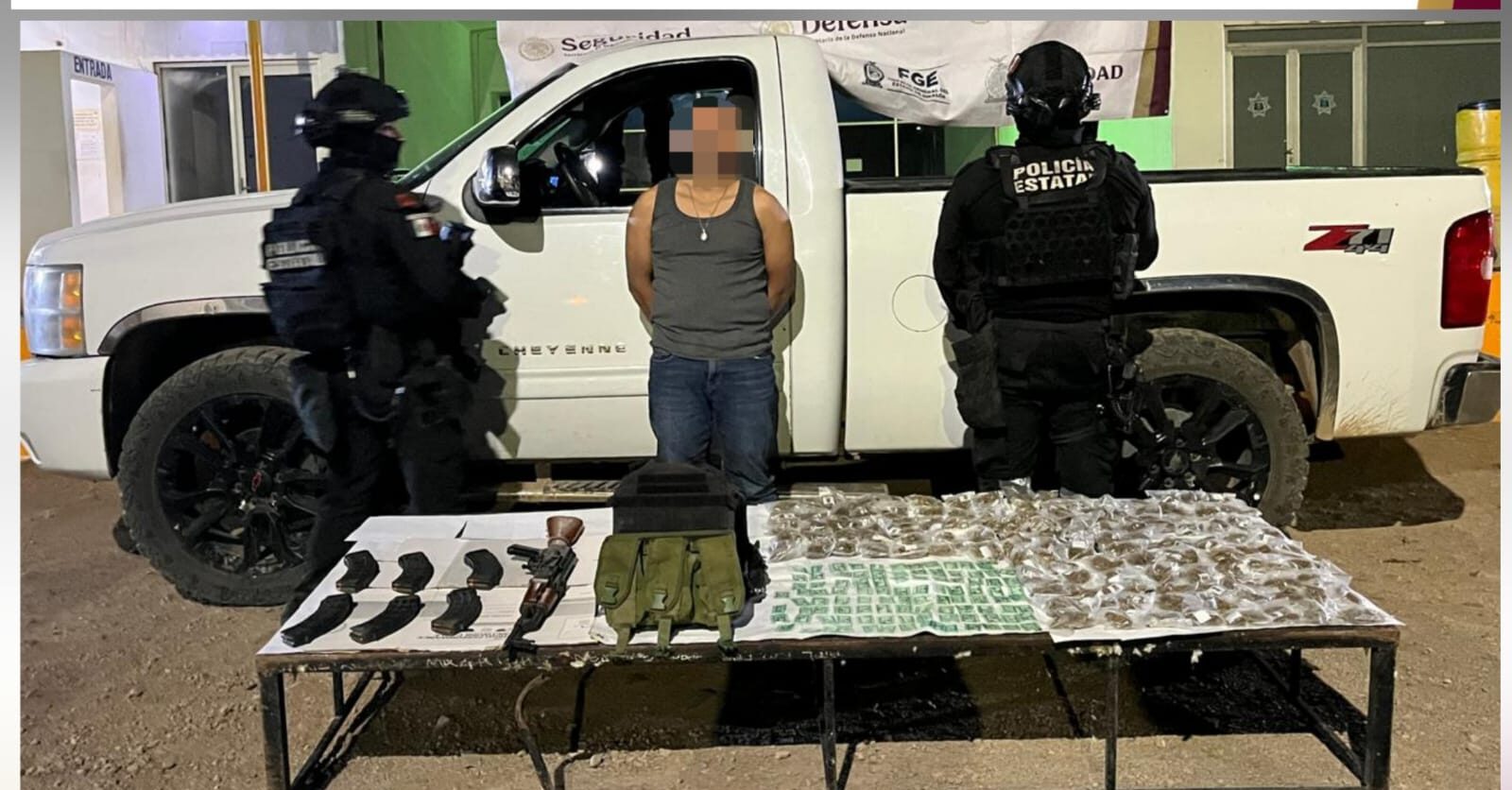 Los elementos del GOES perteneciente a la Policía Estatal Preventiva, realizaban recorridos de vigilancia terrestre en el poblado de Cacalotán, cuando observaron al individuo que bajó de una camioneta portando un chaleco táctico y un fusil de asalto, por lo que le marcaron el alto.