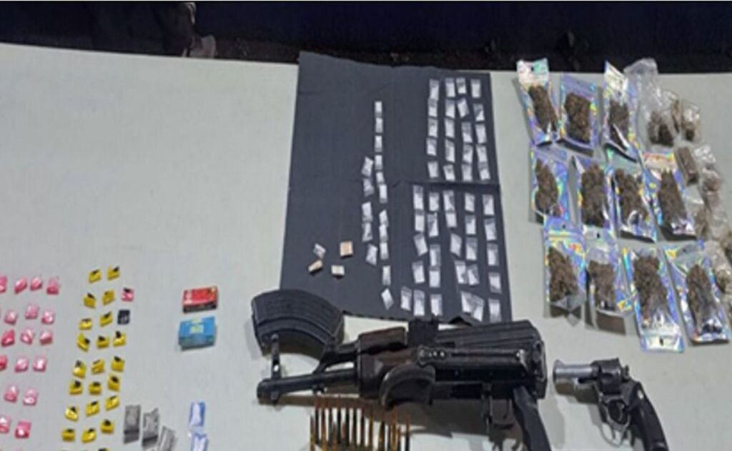 Dentro de un domicilio se detuvo a 15 hombres y una mujer en posesión de 49 dosis de presunto crystal, 29 de aparente heroína, 5 de presunta cocaína, 9 bolsas de aparente piedra y 10 dosis de presunta mariguana.