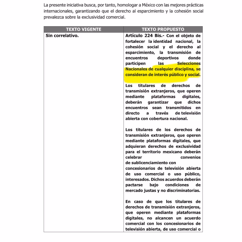 • Artículo 224 Bis.- Con el objeto de fortalecer la identidad nacional, la cohesión social y el derecho al esparcimiento, la transmisión de encuentros deportivos donde participen las Selecciones Nacionales de cualquier disciplina, se consideran de interés público y social.