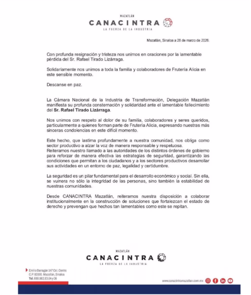 Finalmente, Rafael Tirado Lizárraga, propietario de Frutería Alicia, fue privado de su libertad en Mazatlán, Sinaloa, el 27 de marzo y hallado muerto dos días después. El asesinato provocó la condena de la Canacintra y la Cámara Nacional de la Industria de Restaurantes y Alimentos Condimentados (Canirac), que difundieron mensajes exigiendo la creación de un “entorno de paz, legalidad y certidumbre”.