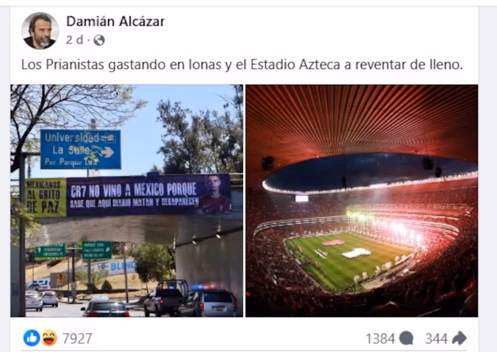 En una publicación reciente, Damián Alcázar escribió en su cuenta de Facebook: “Los Prianistas gastando en lonas y el Estadio Azteca a reventar de lleno”, acompañado de imágenes del estadio abarrotado y de una manta con mensajes críticos sobre la seguridad en México y la ausencia de Cristiano Ronaldo.