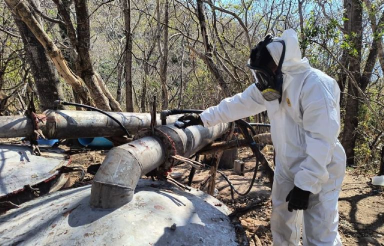 Esta acción se llevó a cabo durante patrullajes de vigilancia aérea y terrestre, durante los cuales se localizó y aseguró un Laboratorio Clandestino, en donde fueron destruidos aproximadamente mil litros de Fenil-2 Propanona, 400 litros de tolueno y 100 kilogramos de sosa caústica.
