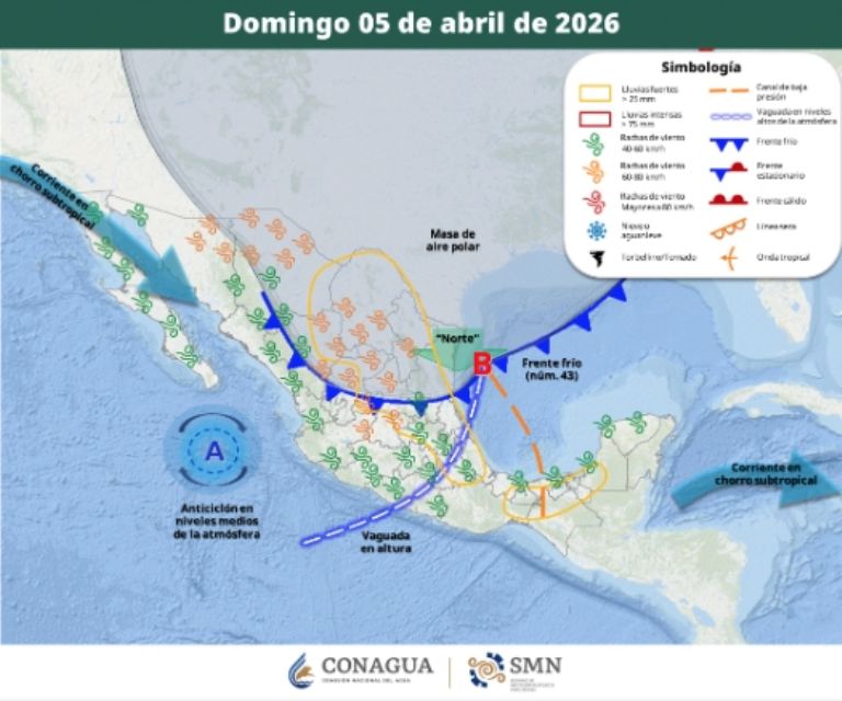 Para el domingo 5 de abril se esperan temperaturas máximas de 40 a 45ºC en los estados de Sinaloa, Michoacán (centro) y Guerrero (noroeste). Acompañado de chubascos con lluvias puntuales fuertes en Michoacán e intervalos de chubascos en Guerrero. Además, rachas de viento de 30 a 50 km/h y oleaje de 1.5 a 2.5 metros de altura en Sinaloa, Michoacán y Guerrero.