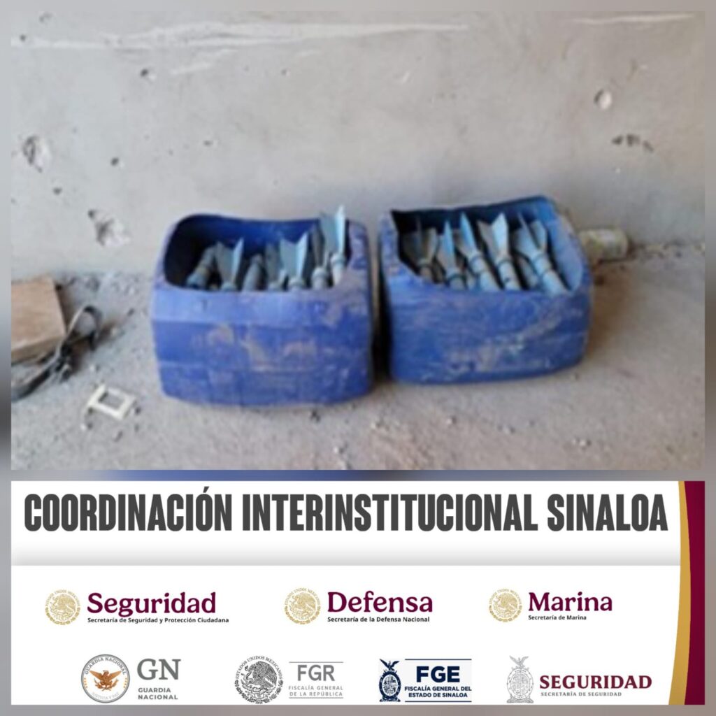 Personal del Ejército Mexicano, en coordinación con la Guardia Nacional, la Secretaría de Marina, la Secretaría de Seguridad y Protección Ciudadana, la Fiscalía General de la República, la Fiscalía General del Estado y la Secretaría de Seguridad Pública de Sinaloa, a través de la Policía Estatal Preventiva, aseguró armas, cargadores, municiones y artefactos explosivos en distintos puntos del municipio de Badiraguato.