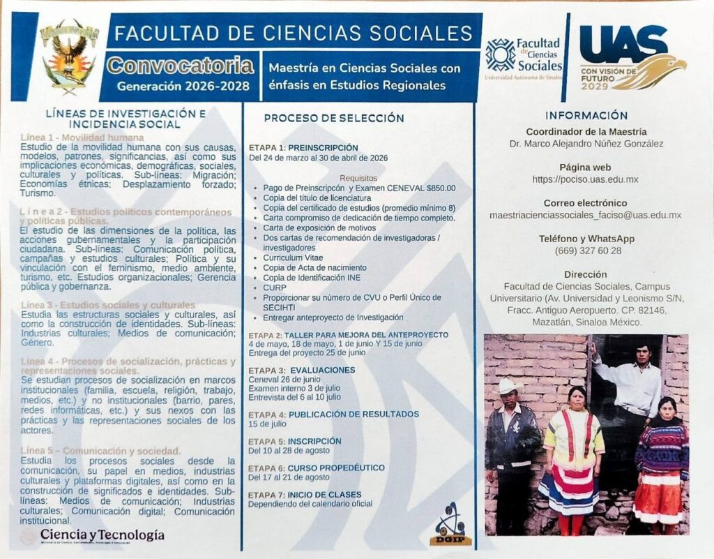 Culiacán, Sin .- La Facultad de Ciencias Sociales (FACISO) de la Universidad Autónoma de Sinaloa (UAS), presentó formalmente la convocatoria para la generación 2026-2028 de su Maestría en Ciencias Sociales con énfasis en Estudios Regionales.