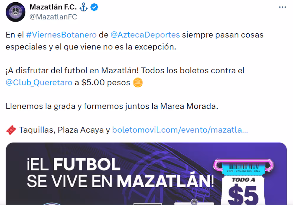 De cara al partido ante Querétaro, correspondiente a la Jornada 15 del Clausura 2026, el conjunto mazatleco puso todos los boletos a cinco pesos.
