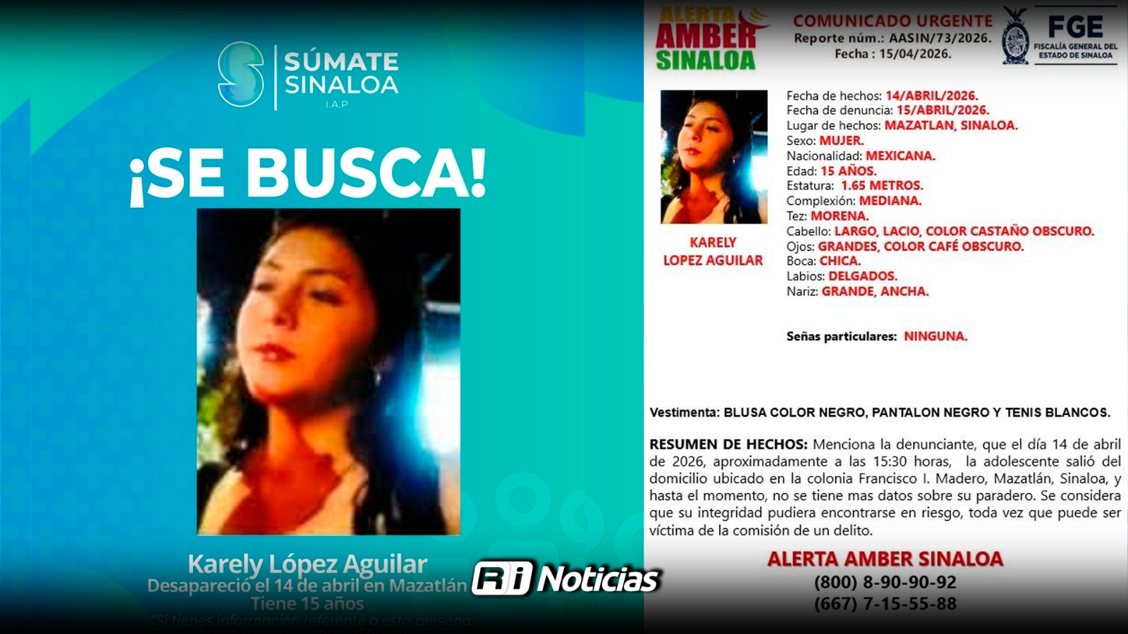Mazatlán, Sin (RI Noticias).- La Fiscalía General del Estado (FGE) emitió una ficha de búsqueda Alerta Amber para localizar a Karely López Aguilar, menor de 15 años que desapareció el pasado martes 14 de abril en Mazatlán, Sinaloa.