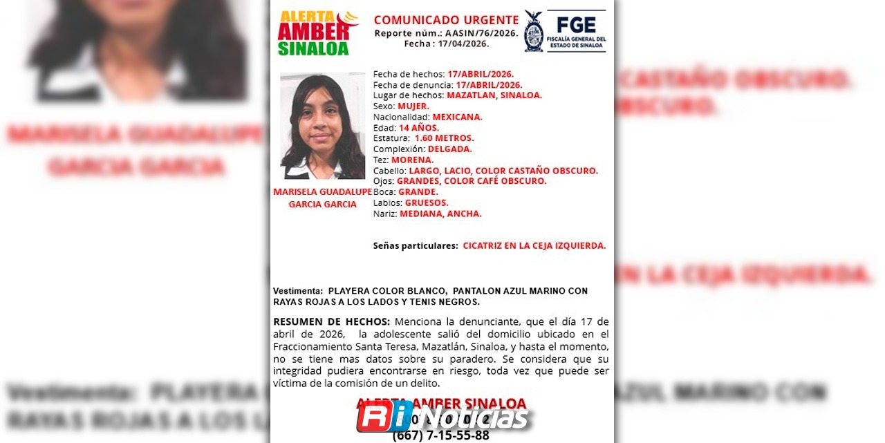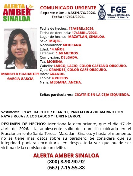 Mazatlán, Sin (RI Noticias).- La Fiscalía General del Estado (FGE) emitió una Alerta Amber para la localización de Marisela Guadalupe García García, una menor de 14 años de edad cuyo paradero se desconoce desde el pasado 17 de abril en este puerto.