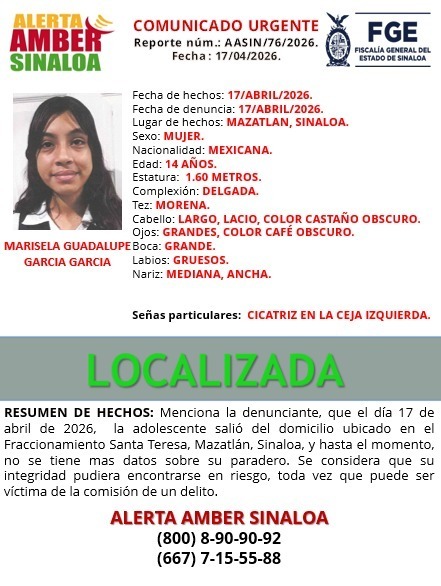 Mazatlán, Sin (RI Noticias).- La Fiscalía General del Estado (FGE) informó sobre la localización con vida de la menor Marisela Guadalupe García García de 14 años la cual fue reportada como desaparecida desde el 17 de abril.