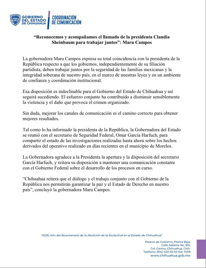 El Gobierno estatal afirmó que mantiene una postura de diálogo permanente con la Federación y coincidió con la presidenta Claudia Sheinbaum en la necesidad de fortalecer la coordinación en materia de seguridad.