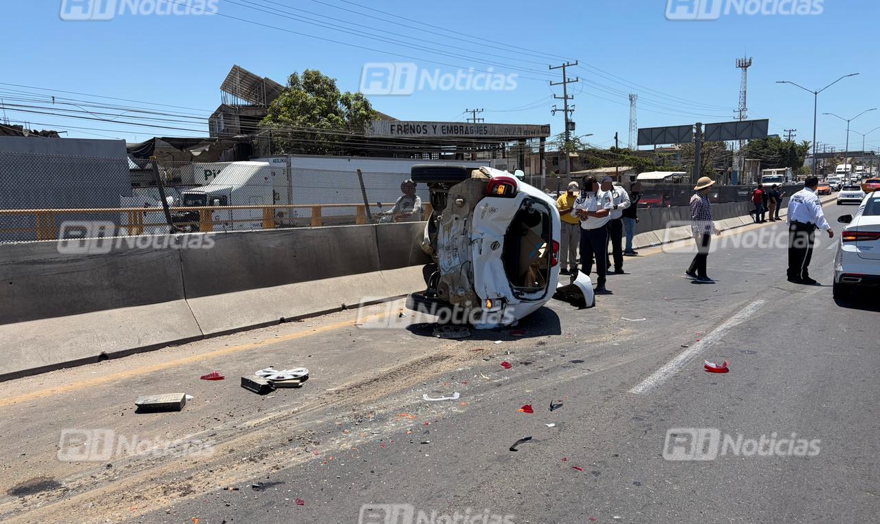 Choque múltiple deja un auto volcado en el puente de El Conchi, al sur de Mazatlán