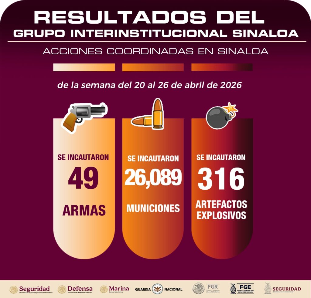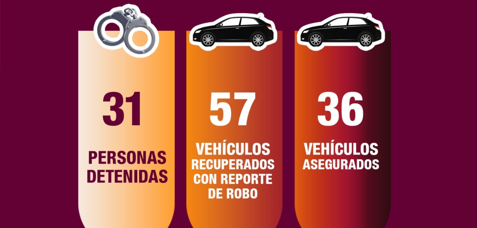 Durante la semana que comprende del 20 al 26 de abril, las corporaciones de seguridad de los tres órdenes de gobierno, recuperaron 57 vehículos que contaban con reporte de robo, además, 31 personas fueron detenidas por distintos delitos y se aseguraron 36 unidades motrices relacionadas con hechos ilícitos. También, se incautaron 49 armas de fuego, 26 mil 89 municiones, así como 316 artefactos explosivos.